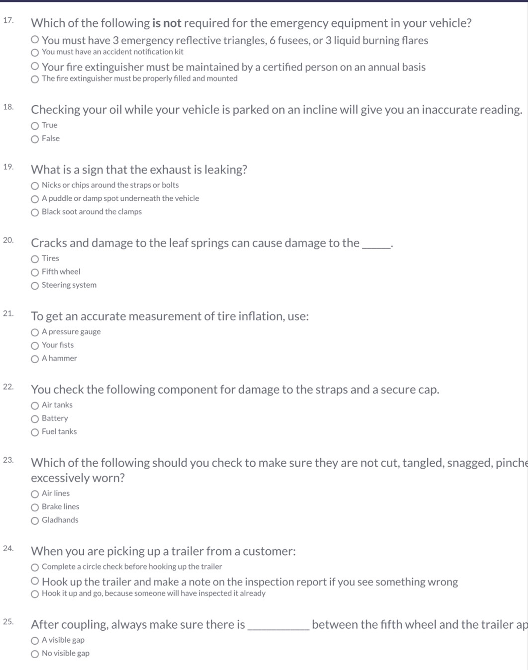 Fully raised with the crank. What gear should the tractor be in after you uncouple the trailer and are inspecting the trailer supports? After you shut off the trailer air supply and lock the trailer brakes, you should. Ace your cdl exam in one take.