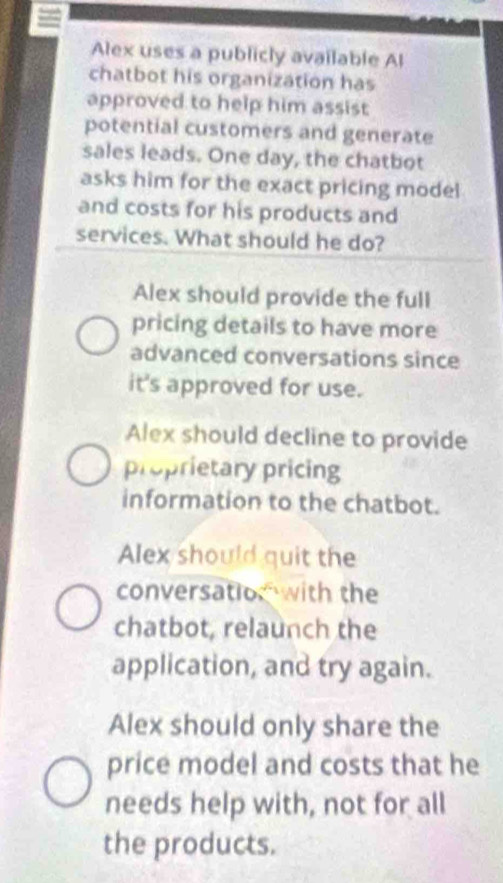 You can type into the chat or use voice dictation to ask alex. Alex uses a publicly available ai chat, but his organization has approved to help them with potential customers and general sales lead one. In this scenario, alex is faced with a decision regarding sharing sensitive pricing information with a publicly available ai chatbot.