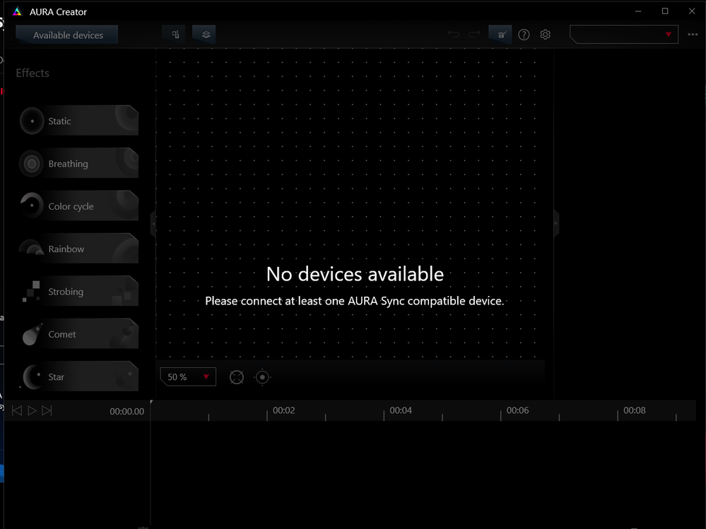 Aura creator is an advanced lighting effect editor for users to create their lighting profile and apply to aura sync. It always says no devices available. I've seen issues for this all. When reinstalling your drivers/app's, make sure you install them in an elevated command, i.e, right click installer>run as. I am not able to find the laptop's keyboard, logo,.