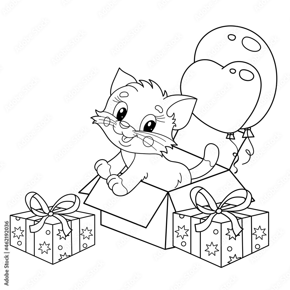 Coloring Page Outline Of cartoon little cat with presents and balloons