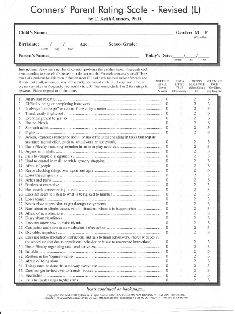 Explore the conners rating scale's role in adhd assessment, including structure, scoring, interpretation, and future developments. For each itern, ask yourself how much of a problem has. Individual number subjects data of birth ? They provide a comprehensive, versatile assessment of psychopathology and problem behavior for children and adolescents.