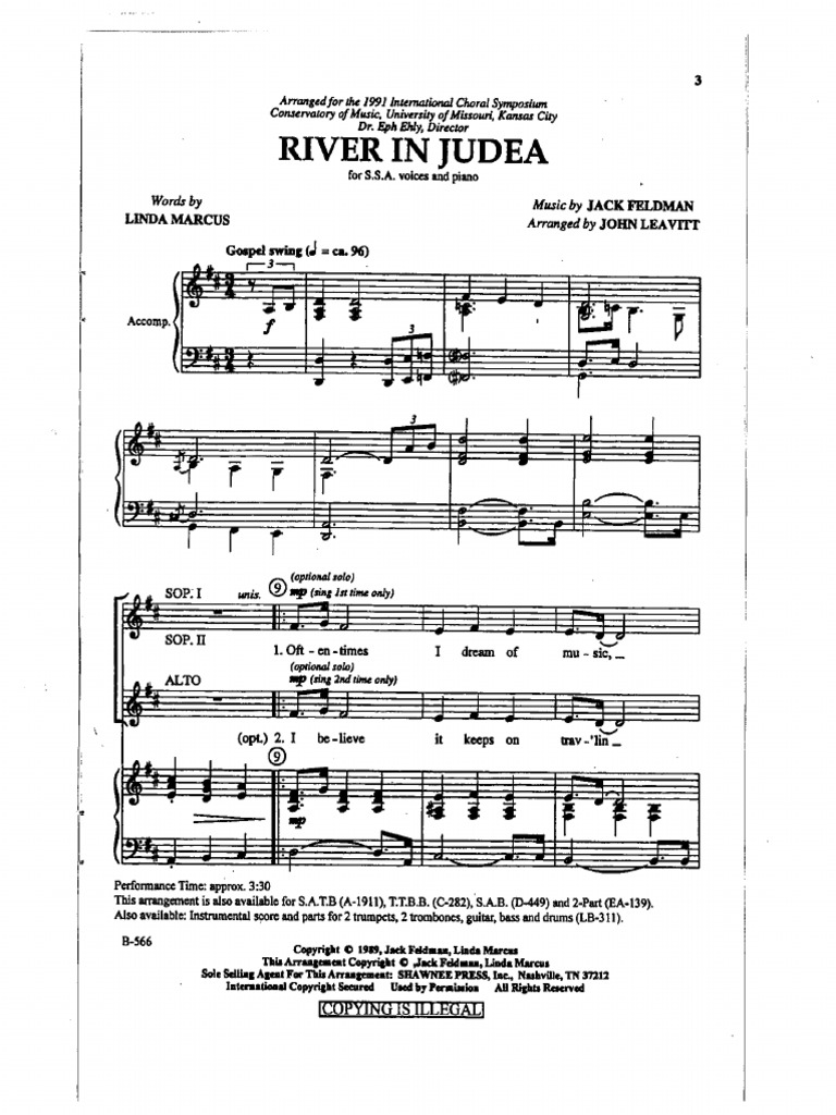 With vocal score notation, lyrics and piano accompaniment. River in judea is suitable for virtually any performance. 2.65 / lyrics by linda marcus, music by jack feldman, arranged by john leavitt. River in judea is suitable for virtually any performance. “river in judea” is suitable for virtually any performance.
