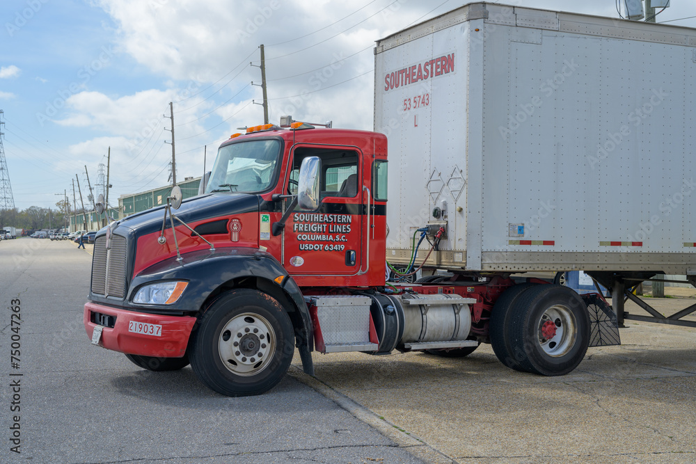 Cab of a Southeastern Freight Lines Truck and Trailer Backed up to a