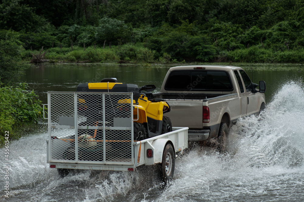 Pickup truck pulling trailer crossing a mighty river in Mexico, Sinaloa